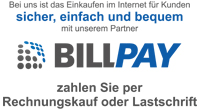 Wenn Sie sich für eine der Zahlungsoptionen unseres Partners Billpay GmbH (https://www.billpay.de/endkunden) entscheiden, werden Sie im Bestellprozess gebeten, in die Übermittlung der für die Abwicklung der Zahlung und eine Identitäts- und Bonitätsprüfung erforderlichen Daten an Billpay einzuwilligen. Sofern Sie Ihre Einwilligung erteilen, werden Ihre Daten (Vor- und Nachname, Straße, Hausnummer, Postleitzahl, Ort, Geburtsdatum, Telefonnummer und beim Kauf per Lastschrift die angegebene Kontoverbindung) sowie die Daten im Zusammenhang mit Ihrer Bestellung an Billpay übermittelt.
